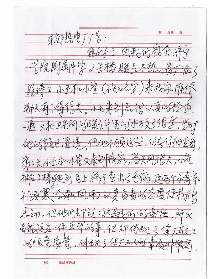 近日,山東聚源熱力公司收到一封來(lái)自濟(jì)寧學(xué)院附屬中學(xué)宿舍張老師寫(xiě)的表?yè)P(yáng)信,信中這樣寫(xiě)道:“東郊熱電廠(chǎng)廠(chǎng)長(zhǎng)(現(xiàn)為山東聚源熱力)您好,因我們宿舍濟(jì)寧學(xué)院附屬中學(xué)2號(hào)樓暖氣不熱,貴廠(chǎng)派了維修工小王和小崔(不知名字)來(lái)我家維修。那天雨下得很大,小王來(lái)到后很認(rèn)真的檢查一遍,又把衛(wèi)生間的暖氣片里的水放了很多,當(dāng)時(shí)他的鞋已濕透,但他不顧這些,仍在仔細(xì)查看。第二天小王和小崔又來(lái)到我家,當(dāng)天風(fēng)很大,小崔搬了梯子爬到房上終于查處了毛病,這兩個(gè)小青年不顧寒冷和風(fēng)雨認(rèn)真負(fù)責(zé)的態(tài)度,使我很感動(dòng),但他們卻說(shuō)這是我們的責(zé)任。雖然這是一件平常的事,但卻體現(xiàn)了您廠(chǎng)職工的服務(wù)質(zhì)量,體現(xiàn)了您廠(chǎng)工人的素質(zhì)非常高,也體現(xiàn)了您廠(chǎng)的廠(chǎng)風(fēng)正,培養(yǎng)了這么好的職工,請(qǐng)領(lǐng)導(dǎo)對(duì)他們進(jìn)行表?yè)P(yáng),號(hào)召全體職工向他們學(xué)習(xí)。弘揚(yáng)正氣,使我們的社會(huì)更加和諧?!?/span>